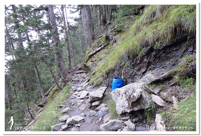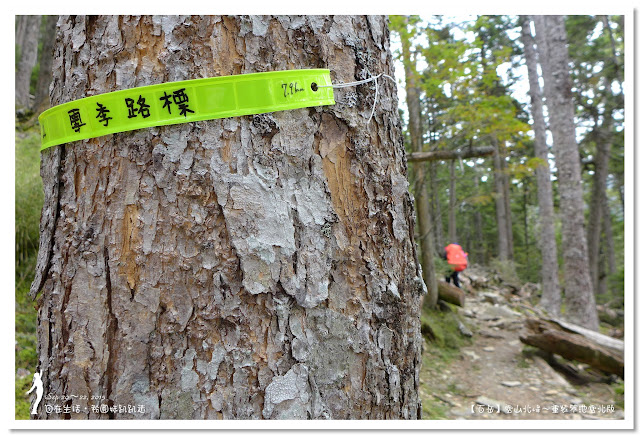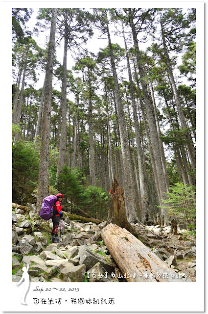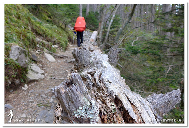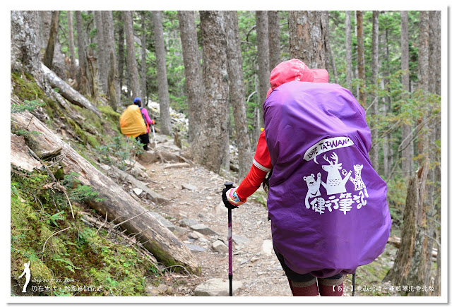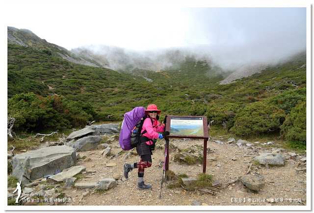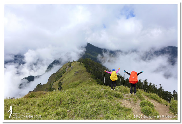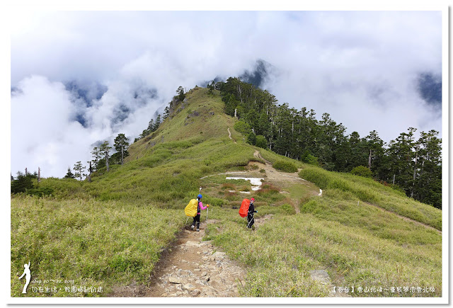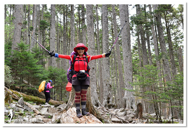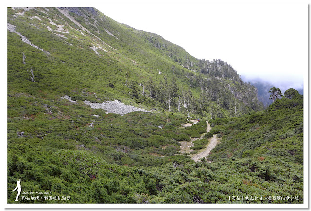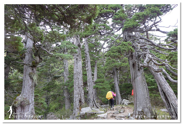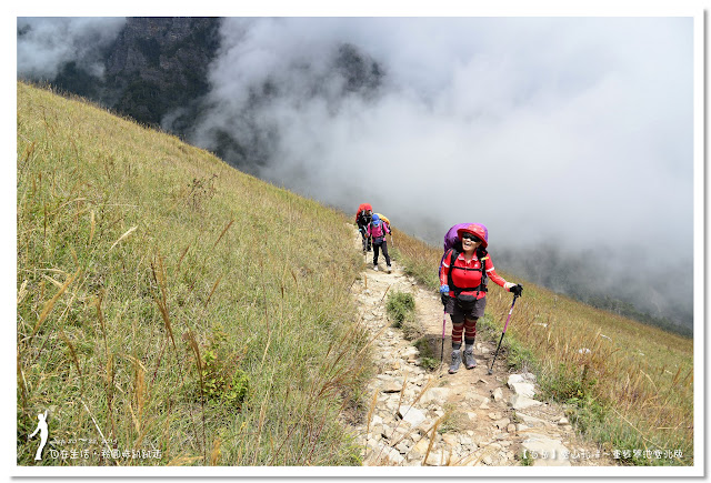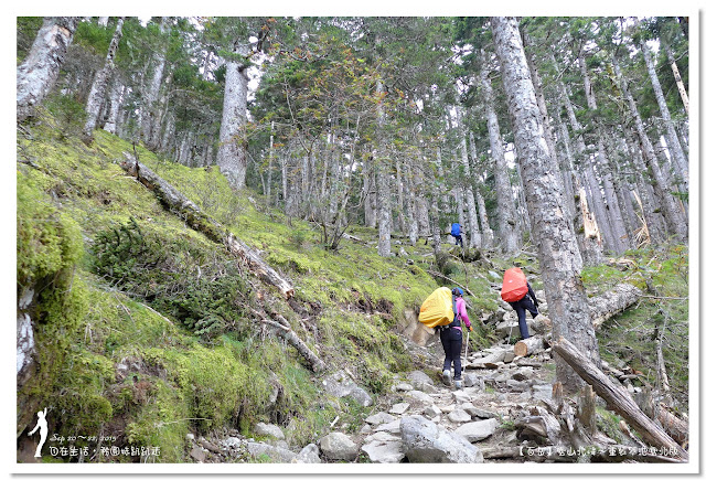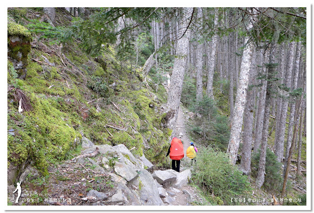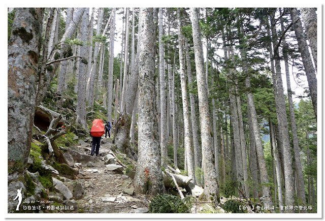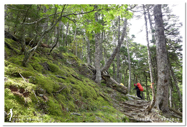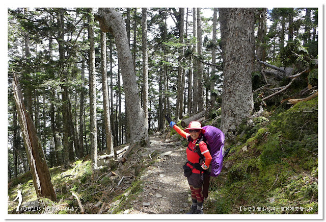 因為要拔營整裝,所以決定比計劃晚一小時,於05:00從登山口出發,前段路大家還沒適應,同學帶隊慢慢走,約1小時抵達七卡山莊,過了七卡山莊後,有段平緩路,大家的速度也逐漸加快,很快就到了讓人聞之喪膽的「哭坡」,哈哈~有需要這麼誇張嗎!? 其實我跟小隊長伉儷說,千萬別被「哭坡」這個名字嚇到,走過翠池碎石坡,就覺得哭坡是小兒科,就只是一點點陡而已啦,不削30分鐘就走完了。天氣陰陰的,厚重的雲密佈,在哭坡平台上看不見中央尖山及南湖大山有些失望,而哭坡也是被山嵐籠罩,幽幽的看不見頂,這樣也不錯,不會被矗高的坡給嚇到,我一股做氣的直上哭坡,連4.1K的哭坡名樹都給錯過了,26分鐘抵達哭坡頂端,這時厚雲有點散開,露出遠方北一段、北二段的山頭,讓我們好興奮,努力的拍照捕捉這瞬間美景。