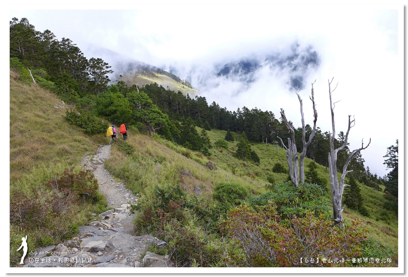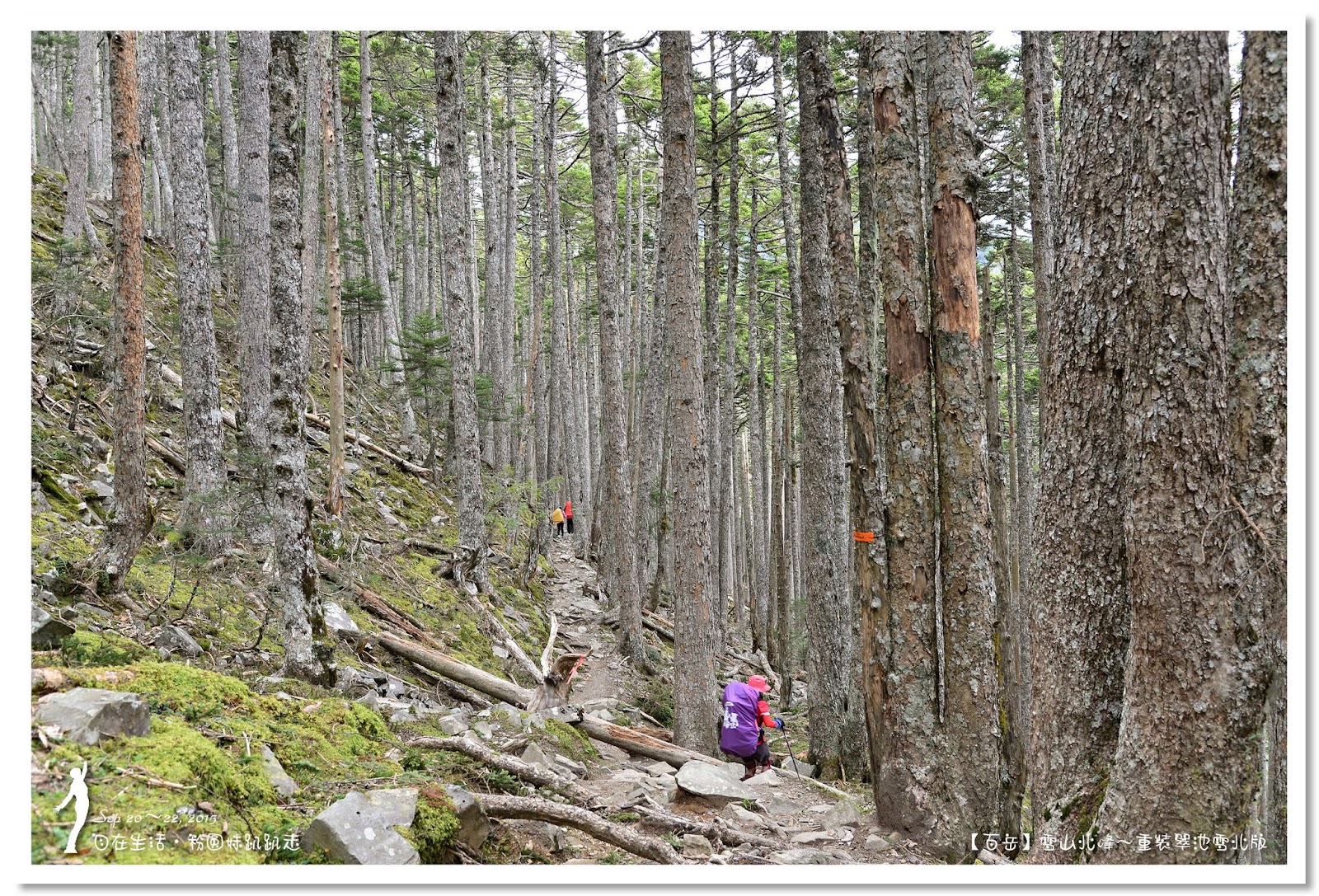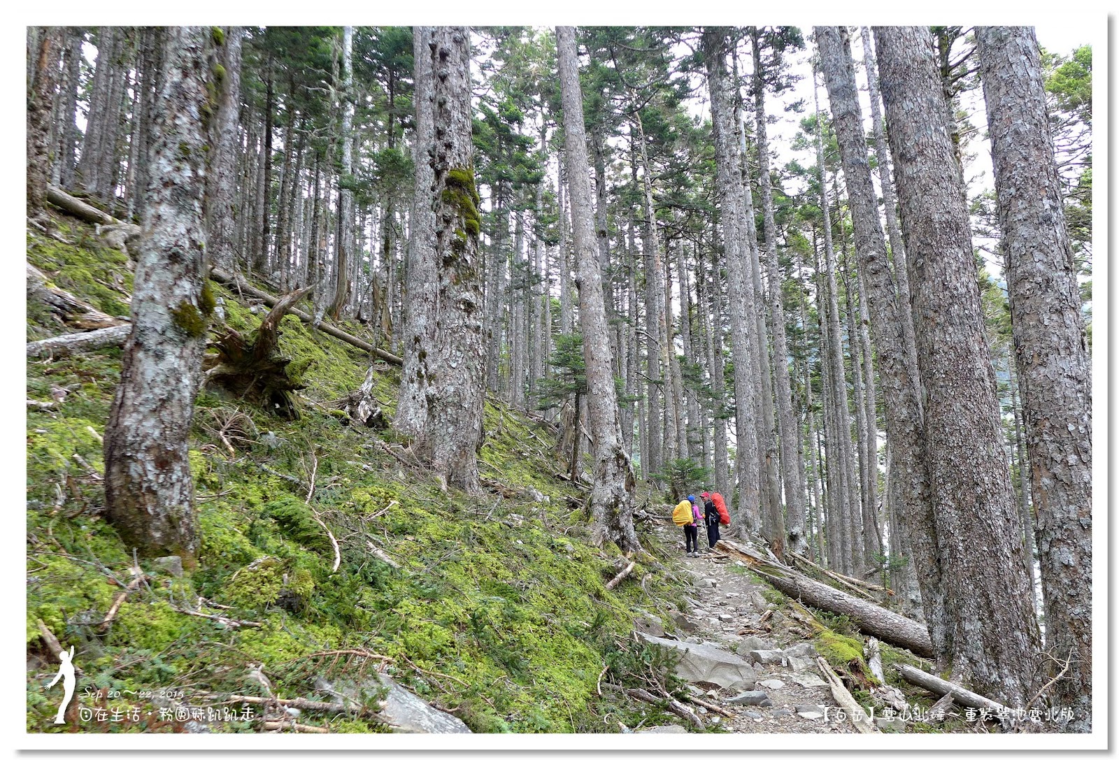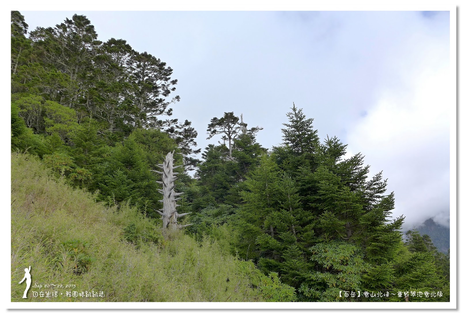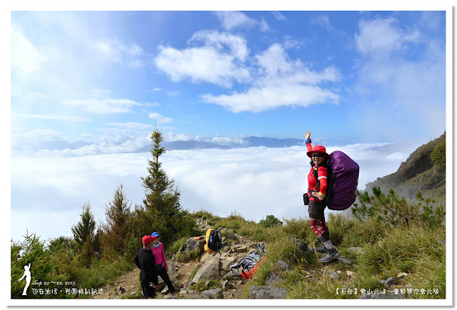 因為要拔營整裝,所以決定比計劃晚一小時,於05:00從登山口出發,前段路大家還沒適應,同學帶隊慢慢走,約1小時抵達七卡山莊,過了七卡山莊後,有段平緩路,大家的速度也逐漸加快,很快就到了讓人聞之喪膽的「哭坡」,哈哈~有需要這麼誇張嗎!? 其實我跟小隊長伉儷說,千萬別被「哭坡」這個名字嚇到,走過翠池碎石坡,就覺得哭坡是小兒科,就只是一點點陡而已啦,不削30分鐘就走完了。天氣陰陰的,厚重的雲密佈,在哭坡平台上看不見中央尖山及南湖大山有些失望,而哭坡也是被山嵐籠罩,幽幽的看不見頂,這樣也不錯,不會被矗高的坡給嚇到,我一股做氣的直上哭坡,連4.1K的哭坡名樹都給錯過了,26分鐘抵達哭坡頂端,這時厚雲有點散開,露出遠方北一段、北二段的山頭,讓我們好興奮,努力的拍照捕捉這瞬間美景。