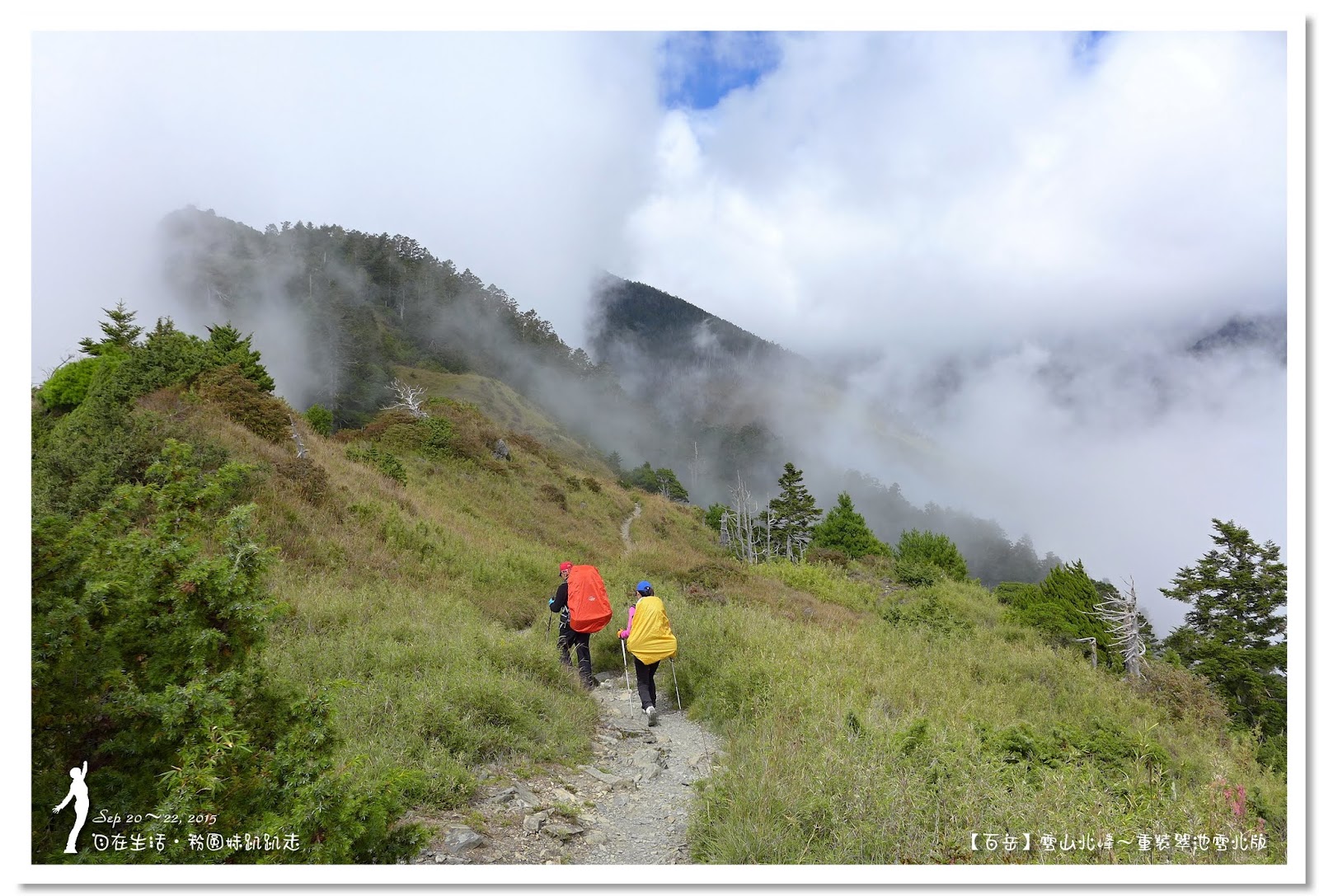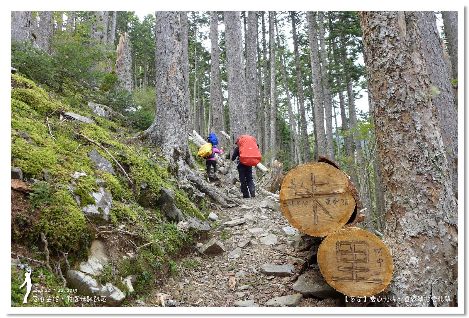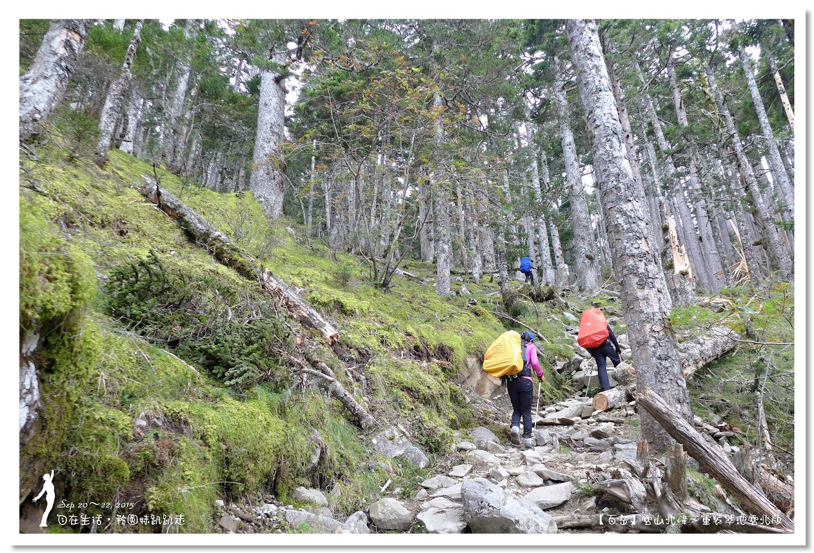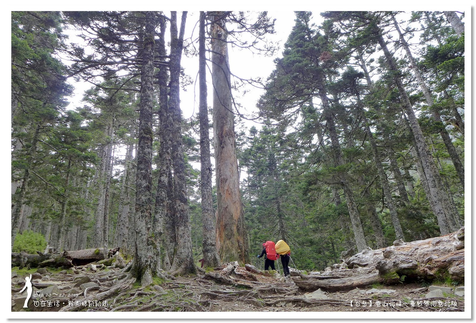 因為要拔營整裝,所以決定比計劃晚一小時,於05:00從登山口出發,前段路大家還沒適應,同學帶隊慢慢走,約1小時抵達七卡山莊,過了七卡山莊後,有段平緩路,大家的速度也逐漸加快,很快就到了讓人聞之喪膽的「哭坡」,哈哈~有需要這麼誇張嗎!? 其實我跟小隊長伉儷說,千萬別被「哭坡」這個名字嚇到,走過翠池碎石坡,就覺得哭坡是小兒科,就只是一點點陡而已啦,不削30分鐘就走完了。天氣陰陰的,厚重的雲密佈,在哭坡平台上看不見中央尖山及南湖大山有些失望,而哭坡也是被山嵐籠罩,幽幽的看不見頂,這樣也不錯,不會被矗高的坡給嚇到,我一股做氣的直上哭坡,連4.1K的哭坡名樹都給錯過了,26分鐘抵達哭坡頂端,這時厚雲有點散開,露出遠方北一段、北二段的山頭,讓我們好興奮,努力的拍照捕捉這瞬間美景。