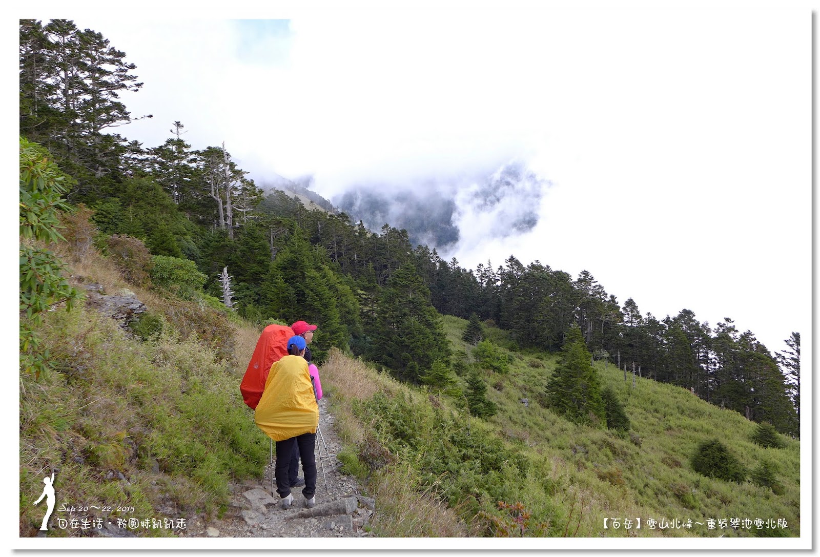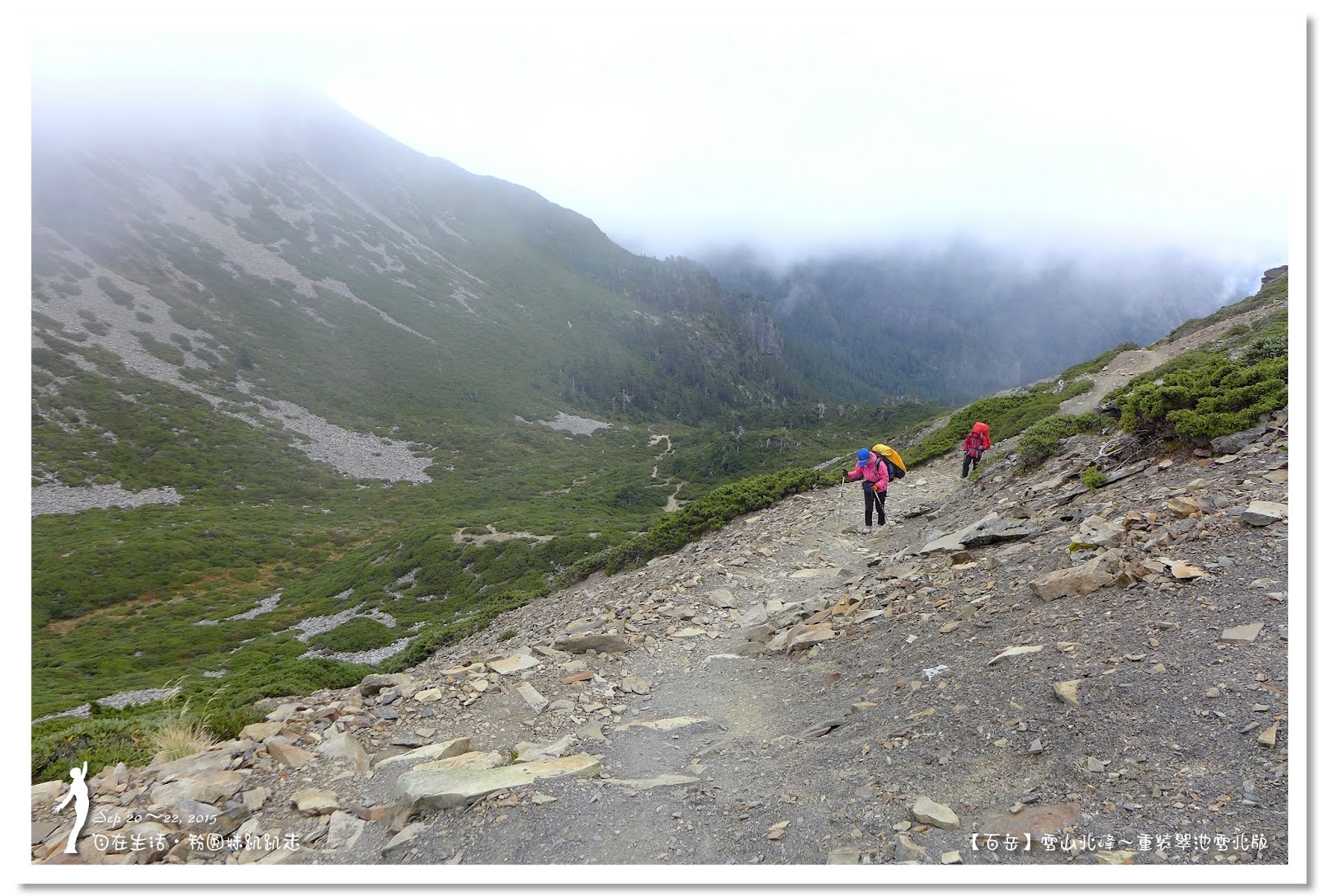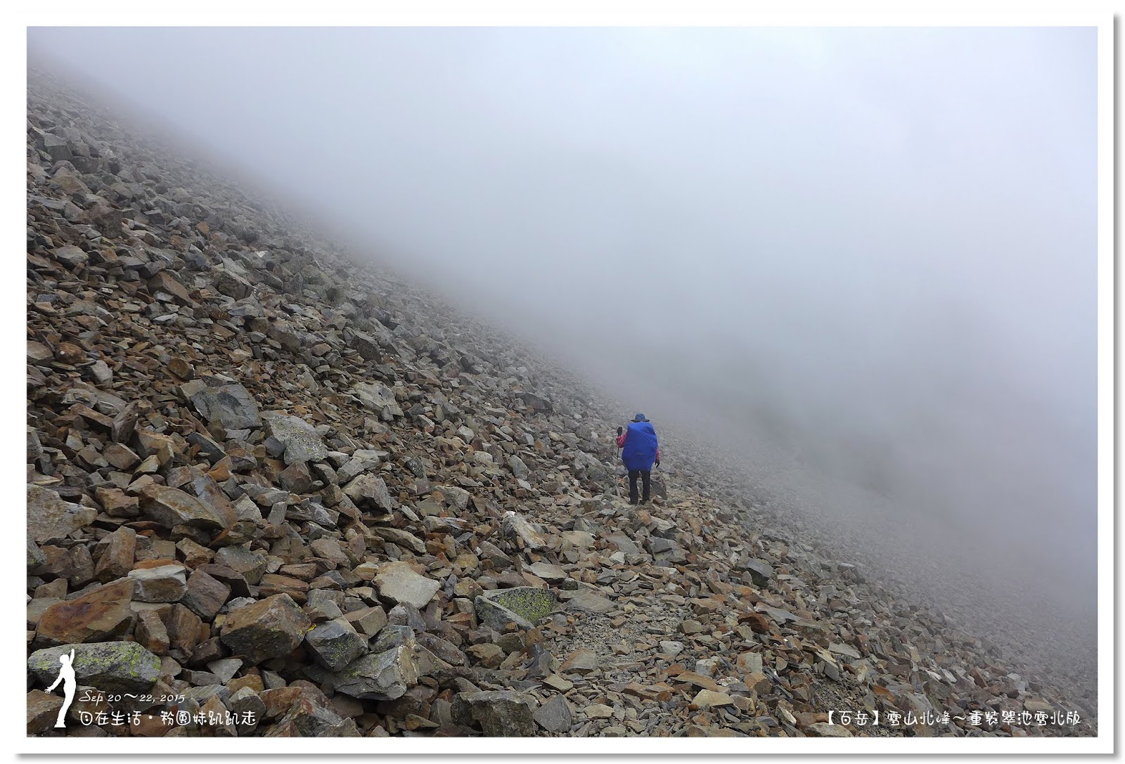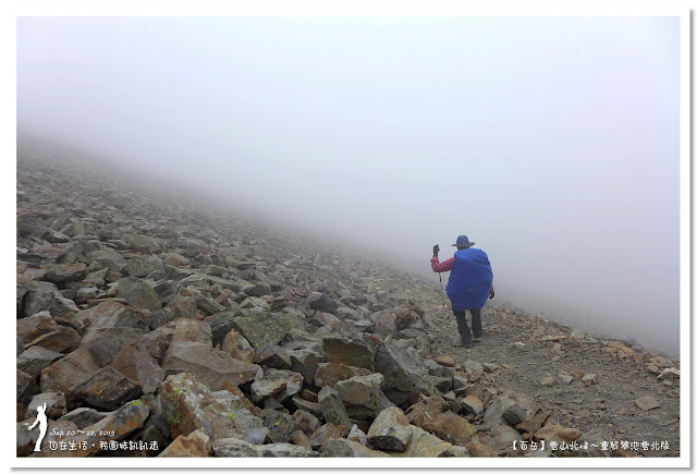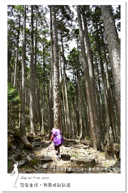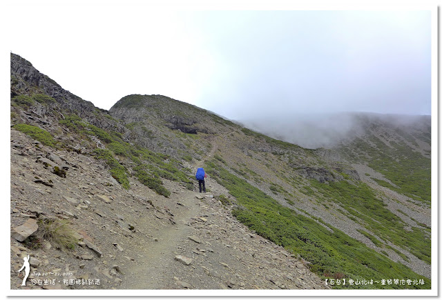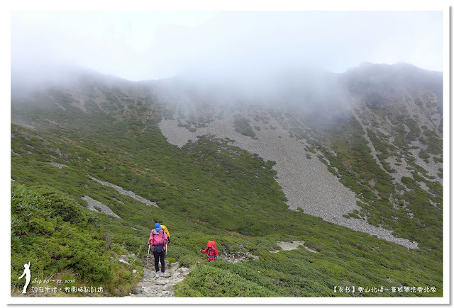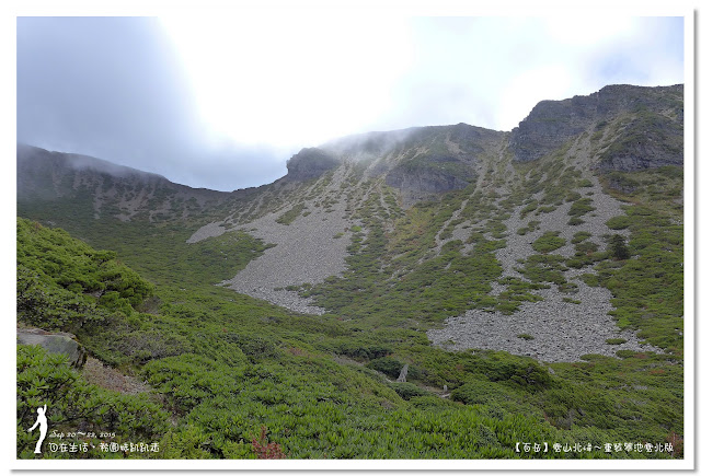 由於黑森林太美麗了,讓我們忍不住一直拍照,走了二個鐘頭才走出黑森林。抵達圈谷底部時,雲霧開始飄來,時而遮住北稜角的臉,這時要從海拔3600公尺圈谷底部,爬升至3886公尺的雪山主峰,這段看似平緩好走的坡路,可是會讓很多人走三步就停一下,尤其高度適應不好的人,在這裡更顯得疲憊不堪,揹著重裝的我們,當然更能體會這種滋味。