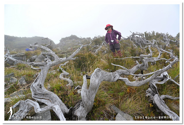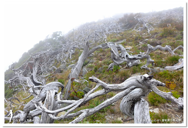 快要登頂前的「玉山圓柏墳場」也是個知名的攝影景點,因為這裡的風勢強勁,生長環境惡劣,讓玉山圓柏的樹幹蜷曲匍匐,不知那年的一場大火,讓這整片的玉山圓柏已經白化了,配上今天迷霧及冷風,真有幾分詭異氣息。
