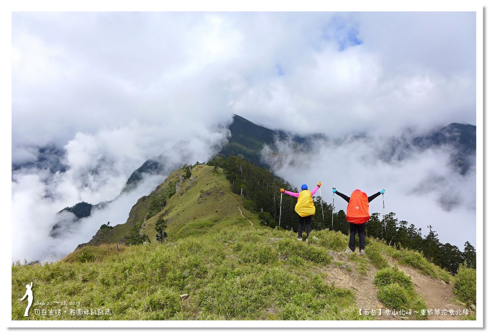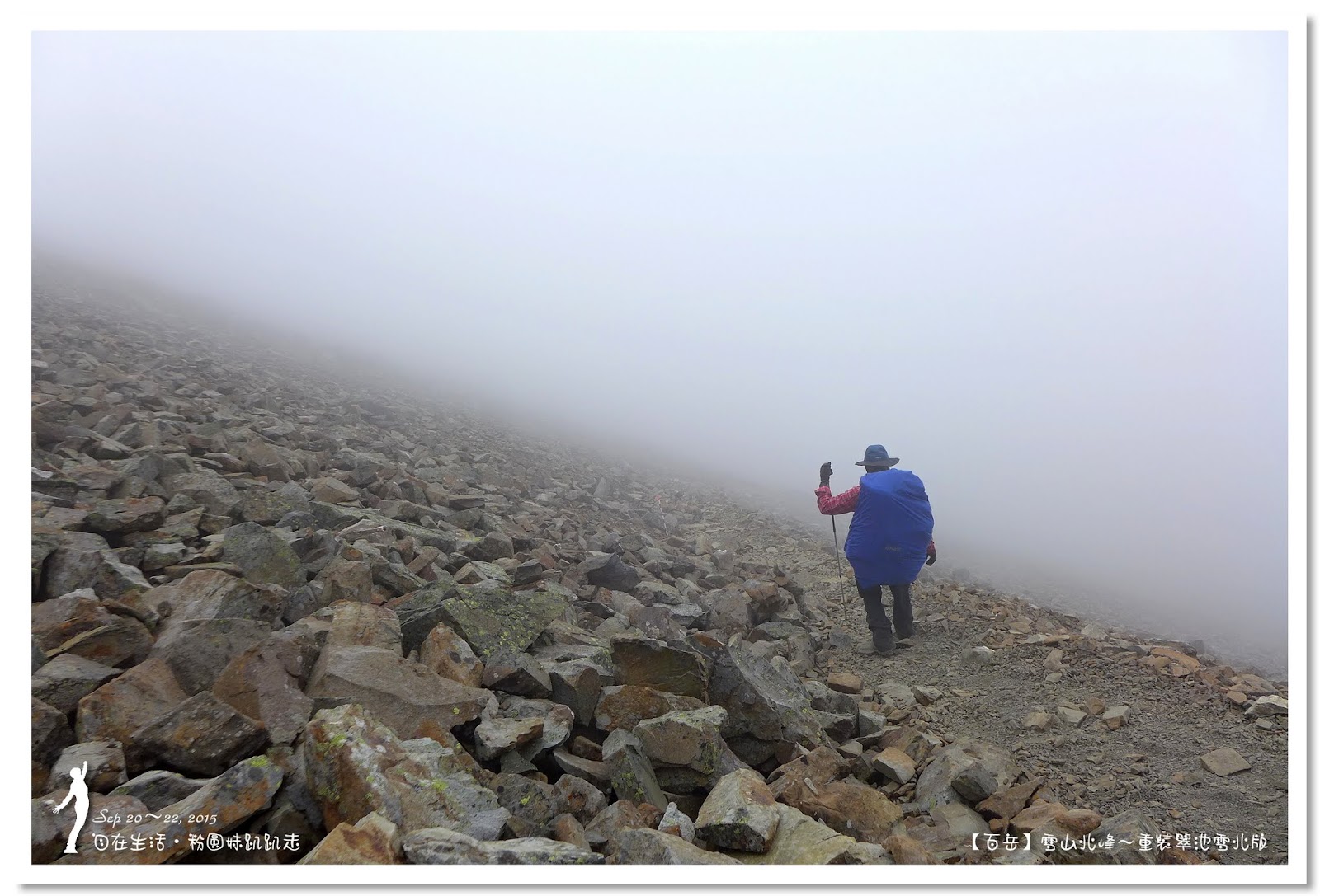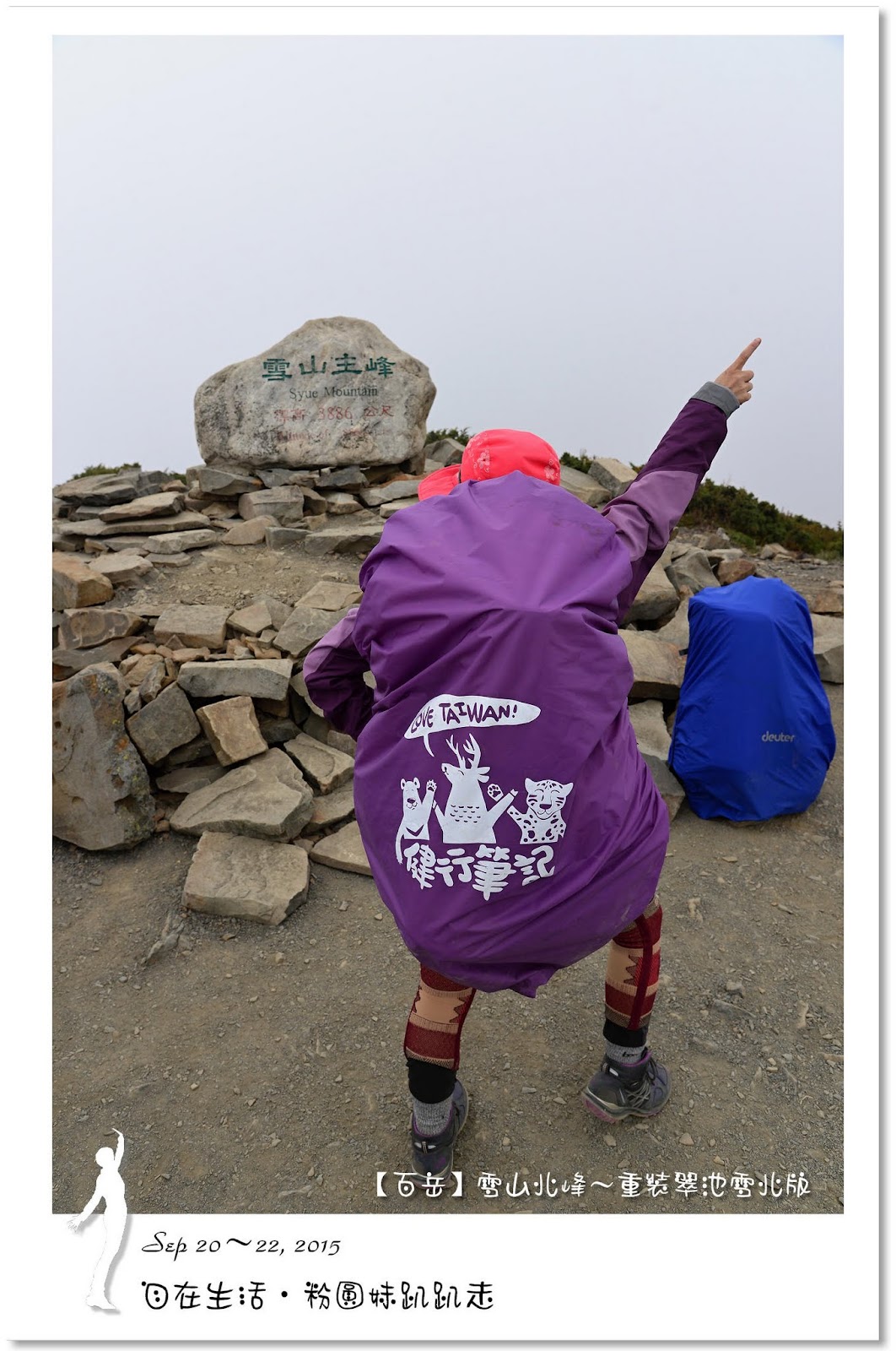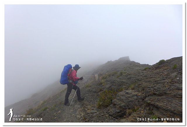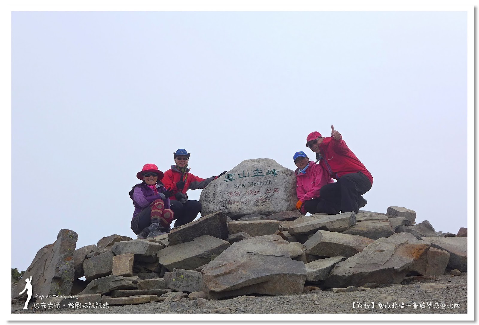 5分鐘即登上雪山主峰,山頂一片白茫茫,完全沒有景可以欣賞,真是可惜,連拍照都提不起勁來,最後想到真是難得重裝上雪山主峰,一定要來拍一張嚇人的重裝照,哈哈哈~五顏六色的背包套,讓白茫茫的畫面增色不少。