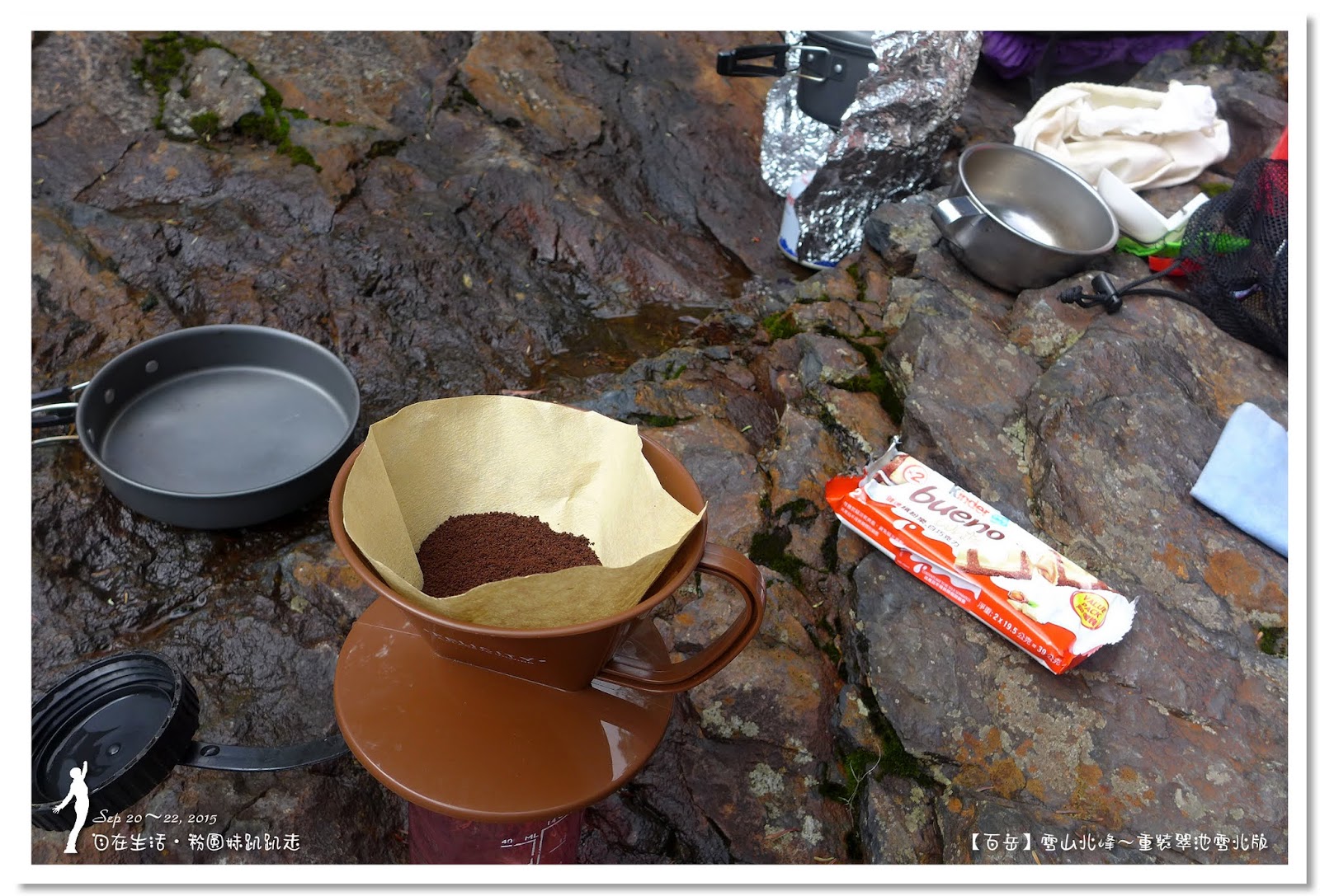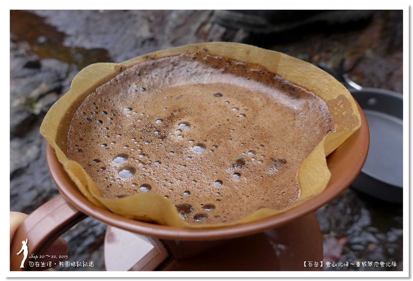 煮滾水倒在濾紙上,看著咖啡粉漸漸產生泡沫,浸淫出咖啡的香氣,一滴一滴琥珀色的咖啡,光看就感覺全身的毛孔都打開了,啜一口咖啡更是充滿著幸福之感,在這天然的溪谷中,山下背上來的沖泡道具,配上清澈的溪水,喝上這一口手沖出來的咖啡,再加上小隊長背了三天的零食,快樂得猶如直上天堂,完美的咖啡時光。