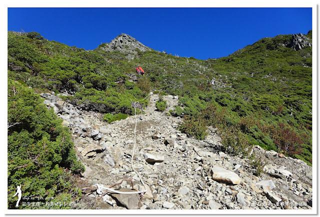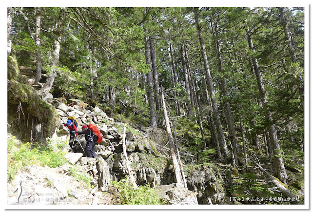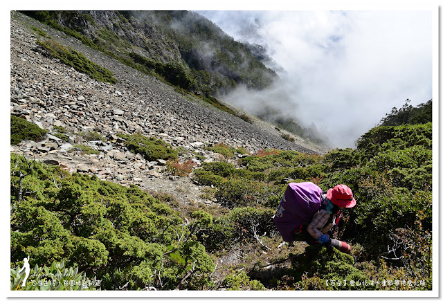 到了中途指標後,改由小隊長在前領路,大家非常專注於腳上碎石坡,只感覺石頭愈來愈大顆,看不出路徑,心想「這麼難走的路,從這條溪源路上雪北真不輕鬆呢!」,石頭又變更大顆了,正在努力奮戰之際,聽到同學在後面喊叫,說我們走過頭了,要再爬回去,同學說「你們是要走到七家灣溪去嗎?」、「怎麼不覺得路怪怪嗎?」,是吧~我們一定是魯碎石坡魯到上癮了,差點魯到七家灣溪去親吻櫻花鈎吻鮭,回望,需重裝上攀的那150公尺碎石坡,我說「一定是爬得不夠,就當是中央尖山爬三步退一步的碎石坡體驗行」。回到正確的路徑,才看到路標在樹欉的小徑裡,在這裡誰會看得到哇~