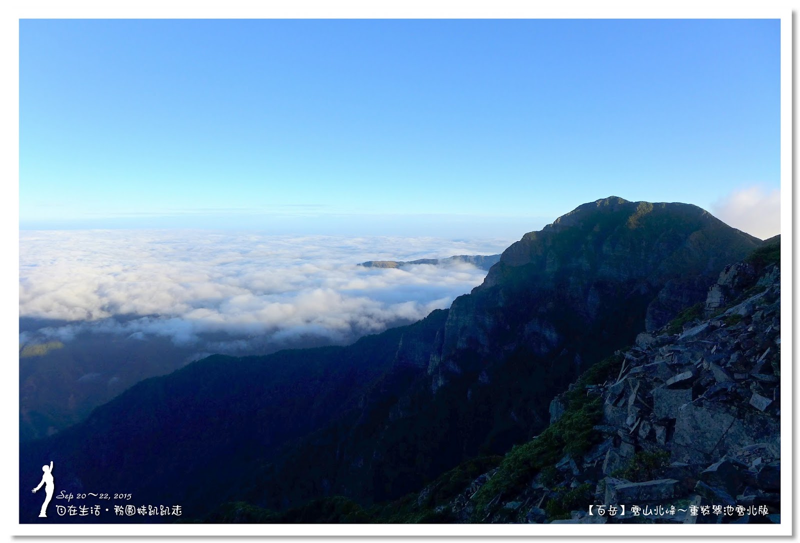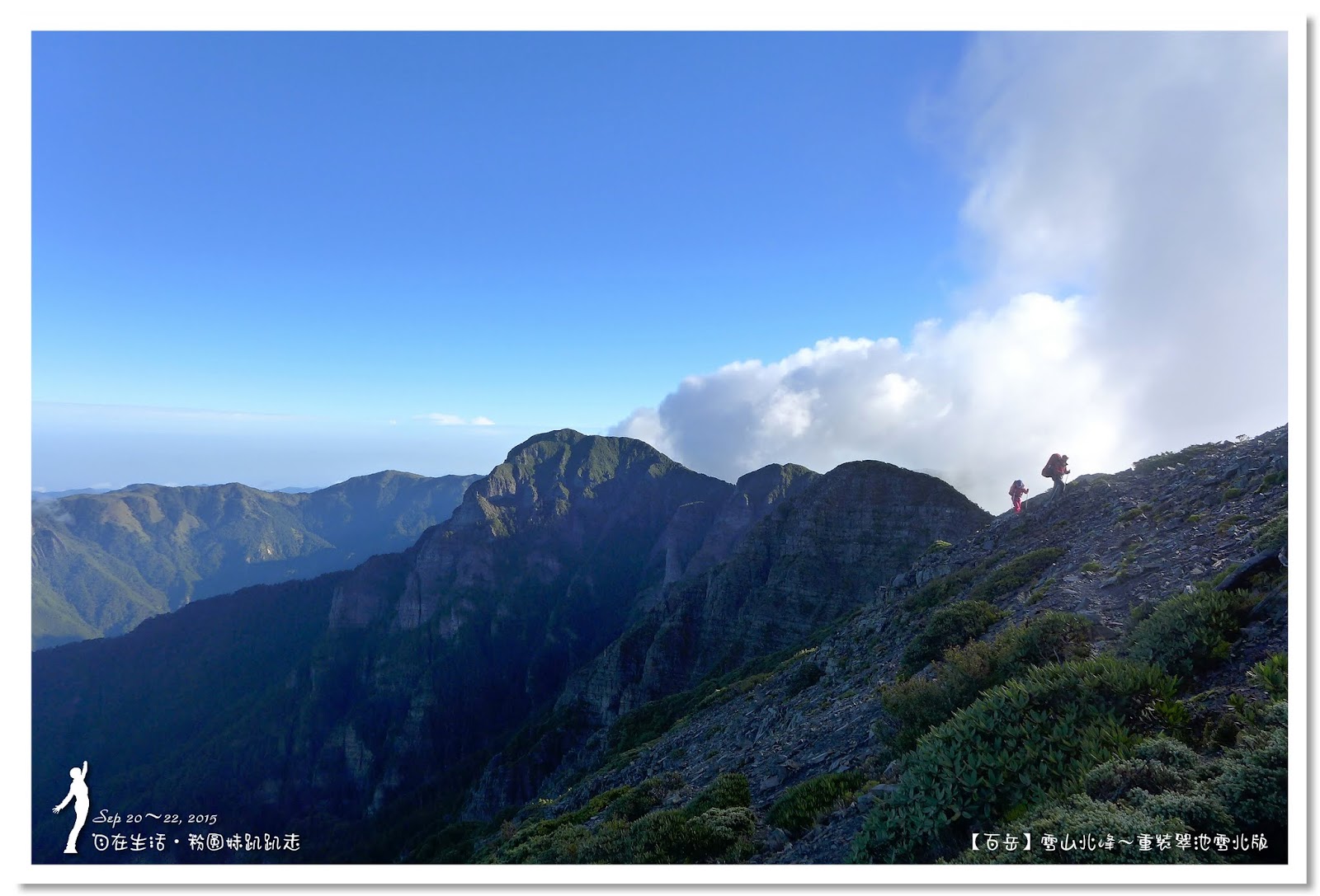 昨天天候不好,完全看不到聖稜線的美,今天老天爺補給我們一份大禮,左邊是雲海、右邊也是雲海,我們走在3600公尺的稜線之上,欣賞大自然的美景,真是說不出來的興奮,一路上相機拍不停,好想把山呀、雲海呀全部都搬回去。