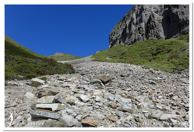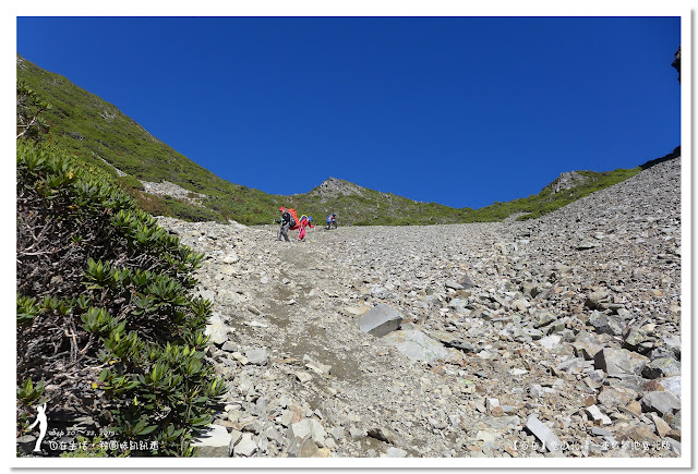 初段的陡下是含土的路段,沒有繩子,利用登山杖輔助即可;中段開始進入會滑動的碎石區,有粗麻繩可以拉,就方便許多,我一手拉繩,一手登山杖在前端剎車,這樣側身滑,非常的順手及快速,刷刷刷~就下來了,在繩子尾端等了一下隊友。再下一段是較大石粒的碎石坡,我是用側刀腳走,同學教了一招用腳跟剎車,也不錯,但不熟悉的走法,還是讓我跌了一跤,屁股撞到石頭好痛,還好沒撞到坐骨。
