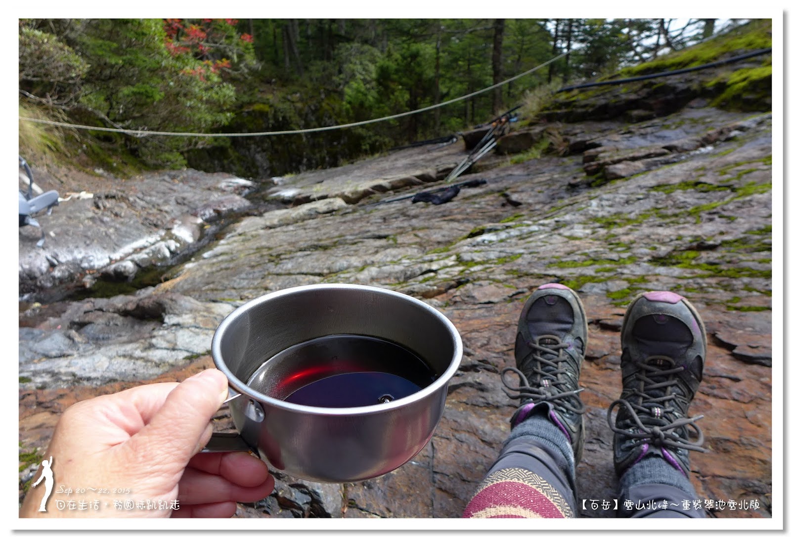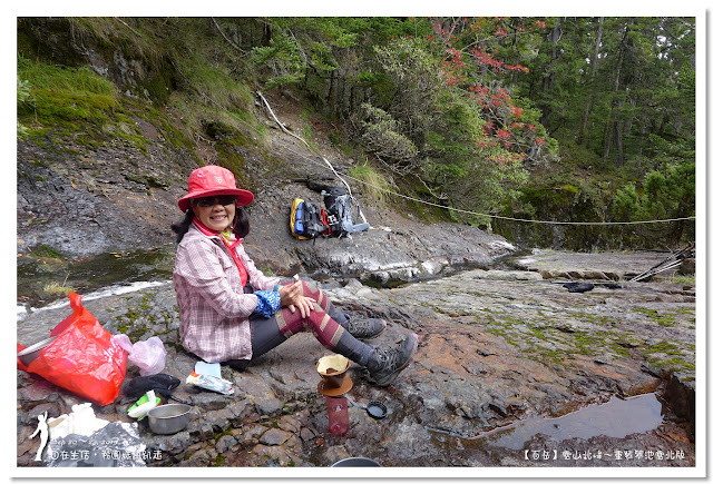 又進入美麗的黑森林,每隔100公尺就會有木椿,這就不會再走錯路了,進入森林又是光線充足的時刻,照耀著筆直的冷杉真是美麗,40分鐘後就走到溪源,清涼的溪水讓我們忍不住要停下來喝口水、洗把臉,「乾脆在這裡休息泡咖啡吧~」,哇~太棒了,用天然山泉水沖泡咖啡,真是人間享受哇~