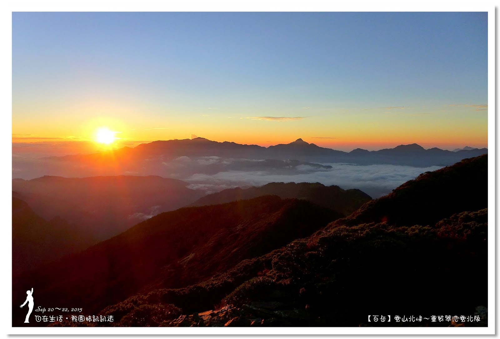 剛好迎接日出跳出雲海的那一刻,緩緩的從南湖大山後方升起