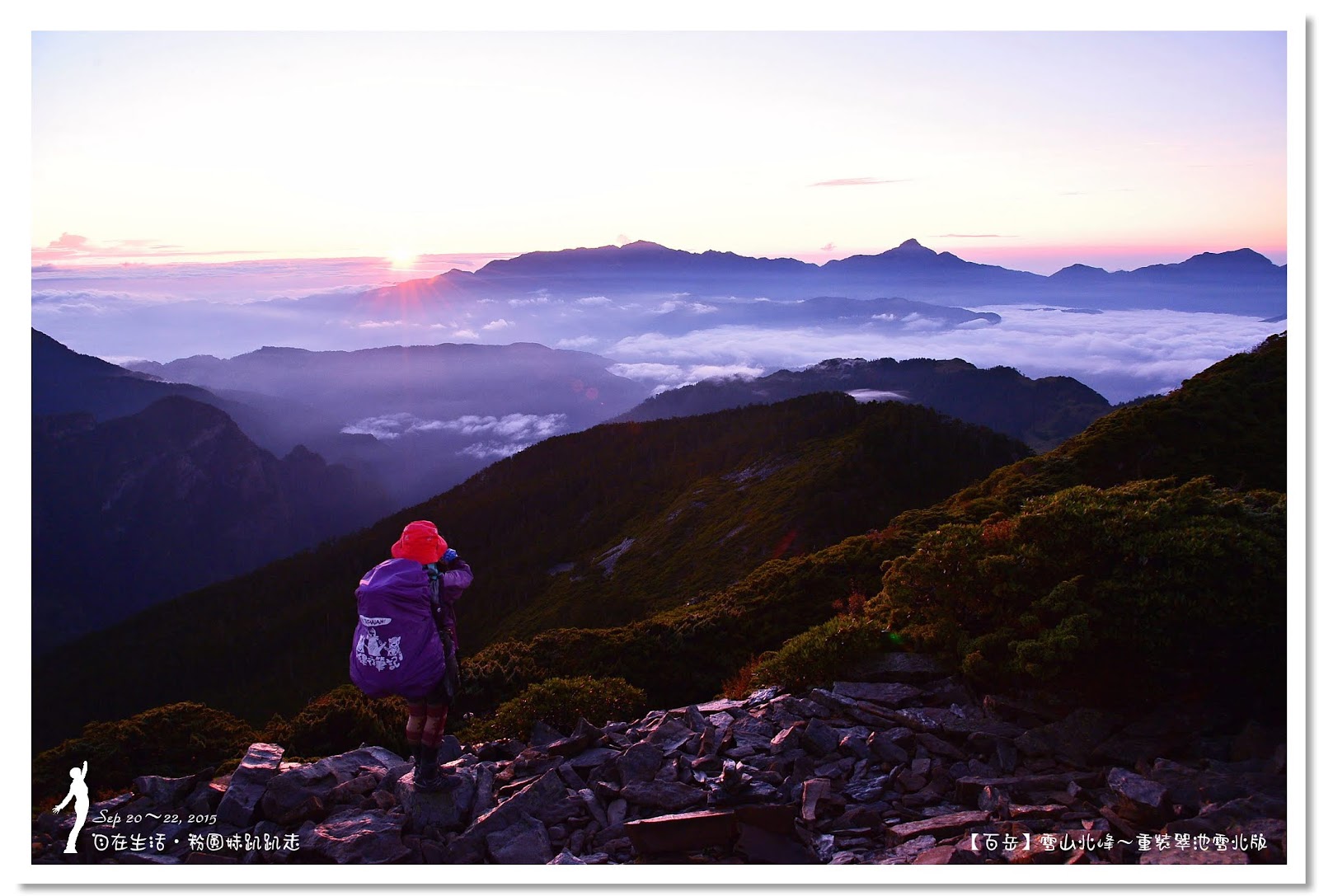 05:10告別夢幻的雪北山屋,啟程下山,走15分鐘剛好走上稜線,這時天邊已染上了紅光,中央尖山、南湖大山被紅光映出美麗的剪影,雲海舉托著連綿的北一段,美不勝收,這時剛好迎接日出跳出雲海的那一刻,緩緩的從南湖大山後方升起,哇~我們是這等的幸運,剛好在視野最佳的稜線上,觀賞這美麗的日出。