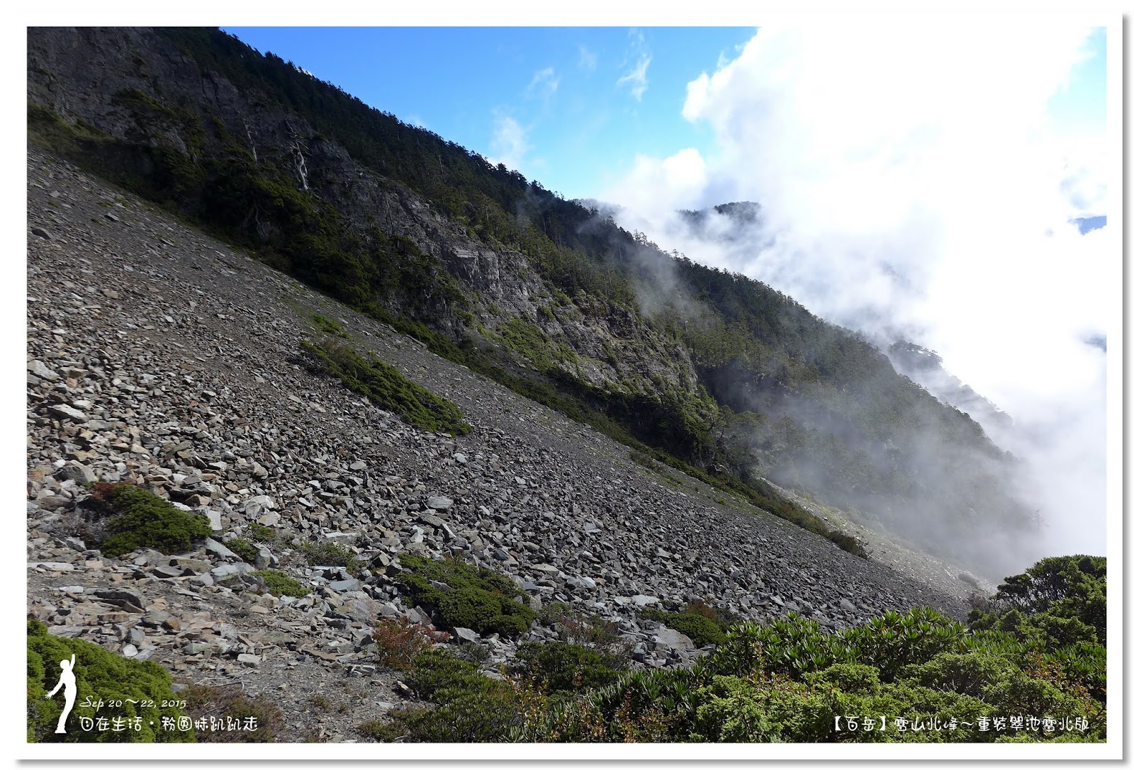 從雪北1.9K下切水源路,一路魯碎石坡魯到上癮過了頭,差點魯到七家灣溪去親吻櫻花鈎吻鮭,被同學叫回來「怎麼不覺得路怪怪嗎?」,回望需重裝上攀的那150公尺碎石坡,我說「一定是爬得不夠,就當是中央尖山爬三步退一步的碎石坡體驗行」。