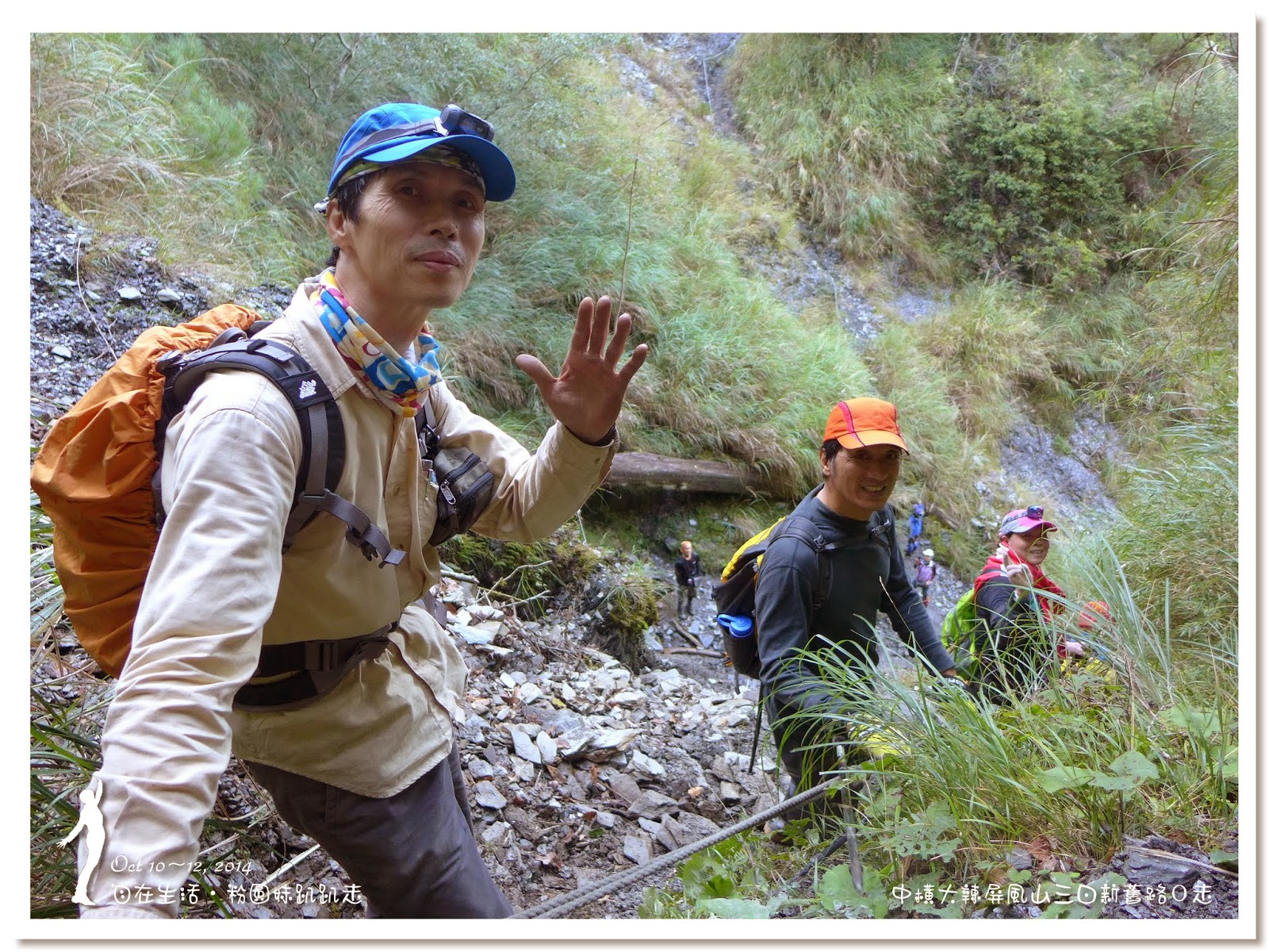 台北山友,要過沒踏點的崩塌地了,多謝他們出手相扶