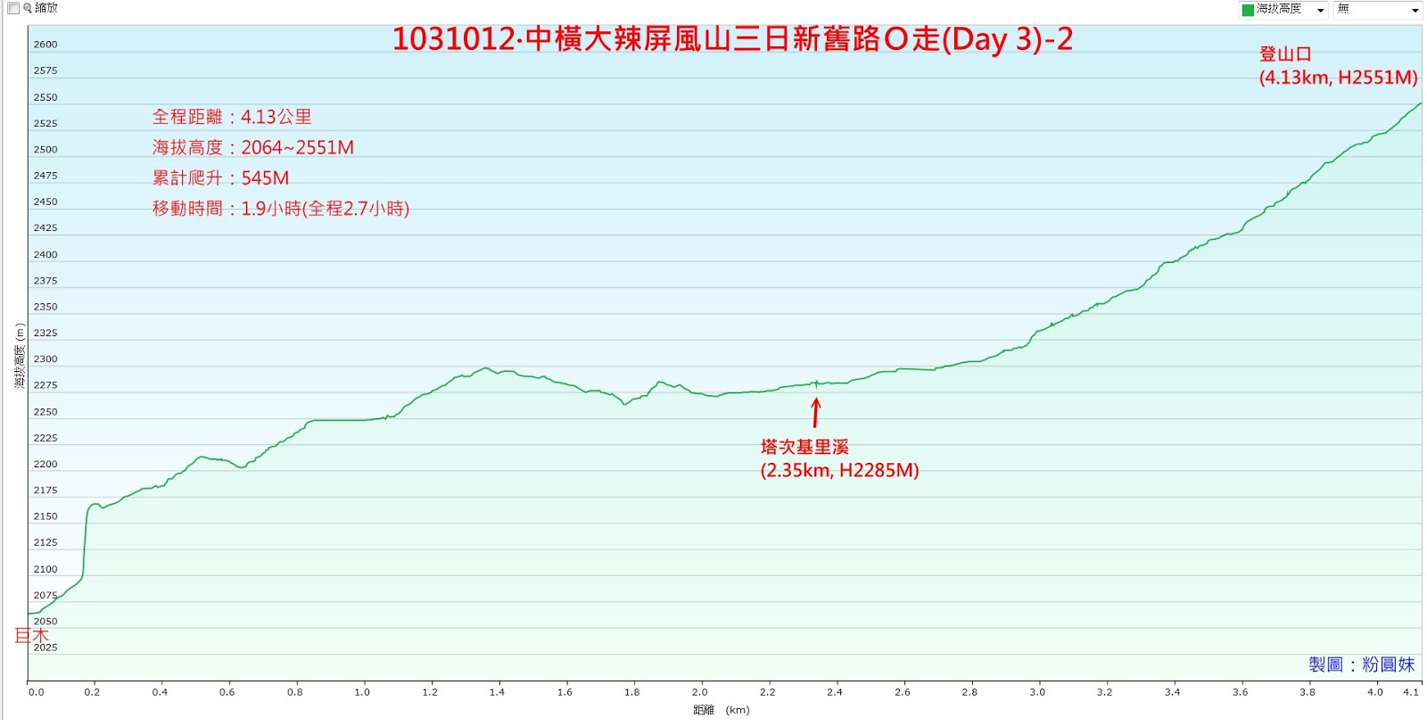 D3:07:20松針營地(III)→07:55松針營地(I)(停留10分鐘)→08:12鐵線吊橋營地→08:19鐵線吊橋→09:15巨木→10:40塔次基里溪(停留20分鐘)→12:00大禹嶺登山口