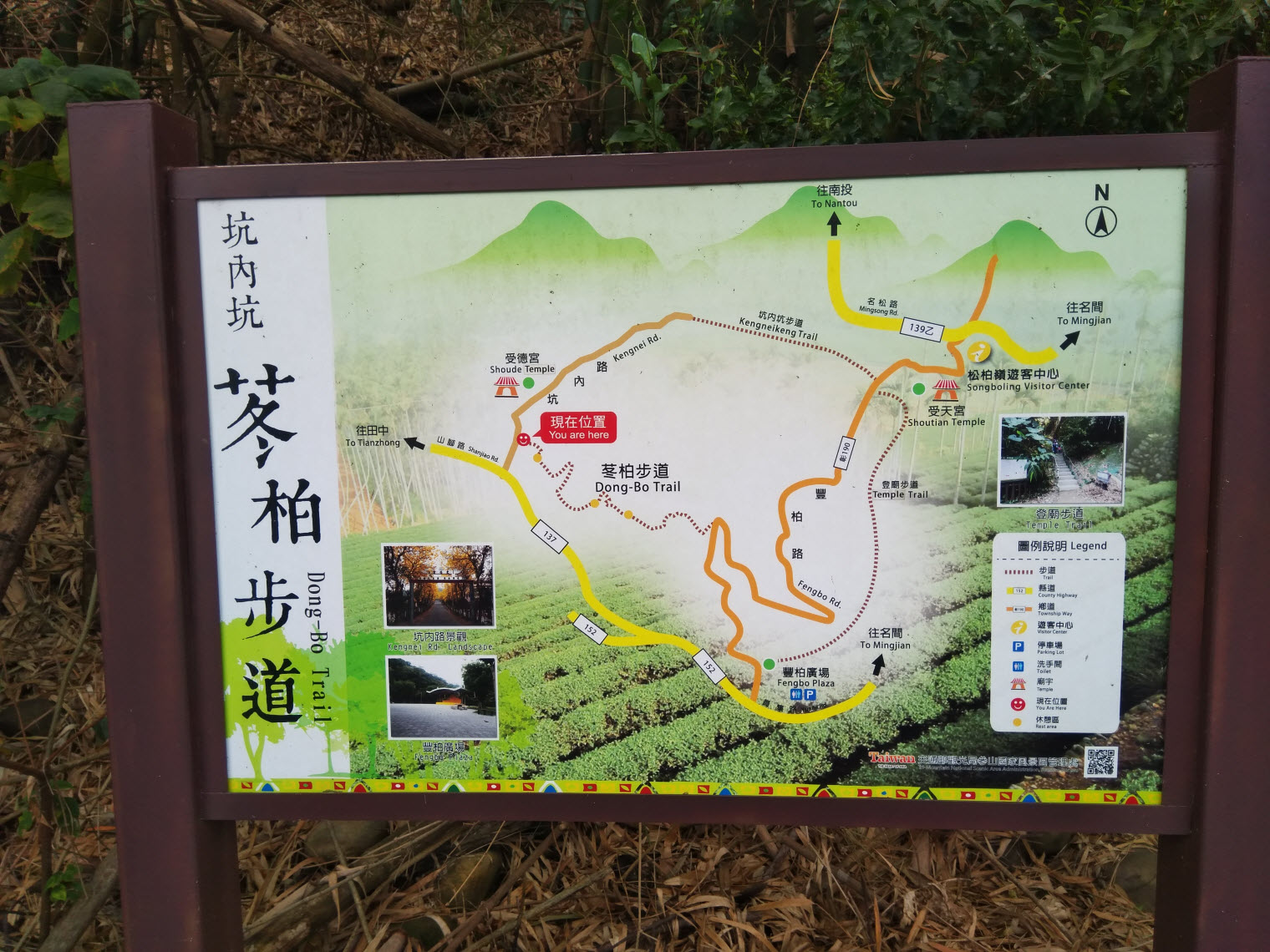 依據導覽圖上所述,坑內坑森林步道是早期居民通往受天宮的進香古道,如今可以透過豐柏廣場旁的豐柏路開車前往,如此一來所謂的進香道路就成為了民眾健行的好去處! 雖說是條古道,但實際走一遭才發現路上有林務局設置的休憩平台及生態示範區,同時步道兩側還有不少的林蔭,若是夏天來此健行也是挺適合的!