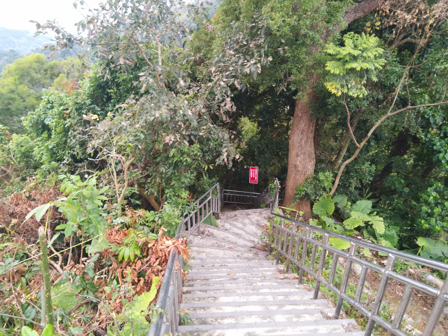 此時本想順著平台旁的階梯一路走登廟步道下山,不過下去沒有幾階發現階梯已損壞變形,加上山坡傾頹而下阻擋前行,因此只好折返回來! 只能說入口處本設有鐵絲線,這就是不信邪的下場!