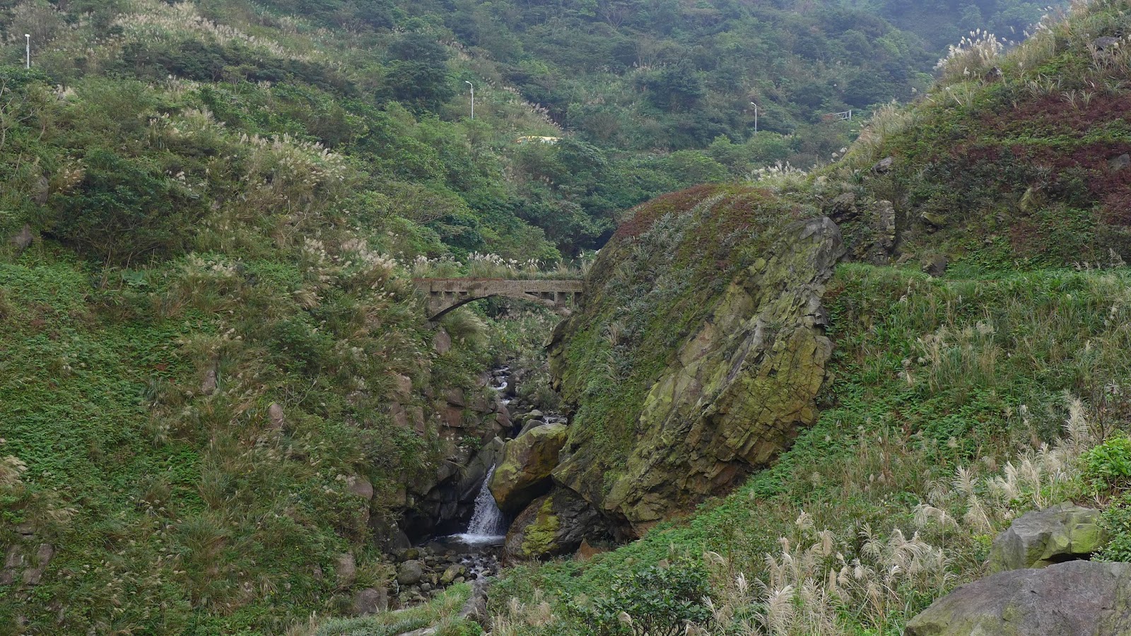 由金福宮右側階梯往下,就可以看到舊水圳橋遺跡,這水圳過去利用地型的智慧取水供選礦廠使用,取內九份溪與外九份溪水,外九份溪另一處水圳橋遺跡,有著特殊的三層橋景觀,時間關係這一部份留待下回再探。